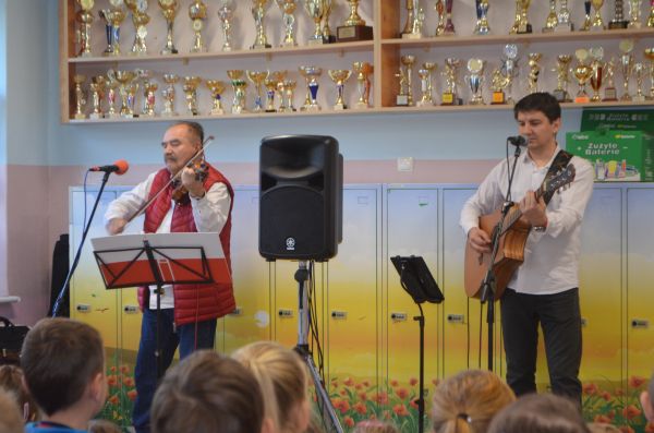 W czwartek, 6 listopada 2018 roku, gościliśmy zespół muzyczny "VIOL - ART" Leszek Bolibok. Zespół wystąpił z repertuarem pt."Przeboje mistrzów muzyki polskiej" z okazji 100 - lecia Odzyskania przez Polskę Niepodległości. Prowadzący opowiadał o historii Polski. W repertuarze znalazły się największe polskie pieśni patriotyczne na przestrzeni wieków. Uczniowie brali czynny udział w koncercie. Przy akompaniamencie skrzypiec i gitary zaśpiewali m.in. pieśni: "Ułani, ułani", "Piechota", "Legiony", "Pierwsza kadrowa". Nie mogło oczywiście zabraknąć "Mazurka Dąbrowskiego". Uczniowie uczący się języka kaszubskiego zaśpiewali pieśni w języku kaszubskim: "Marsz kaszubski", "Żeglorz", "Kochóny stori Gduńsk". Ponadto uczestniczyli w zabawach muzycznych zaproponowanych przez zespół.
