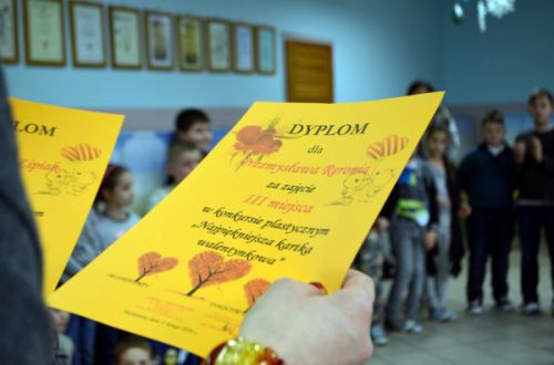 Tuż przed feriami odbył się apel, na którym nagrodzono uczestników ostatnich konkursów. Zanim uczniowie odebrali dyplomy Pani Dyrektor przypomniała wszystkim by zachowali szczególną uwagę podczas zabaw w czasie wolnym. Po omówieniu kwestii bezpieczeństwa doszło do dekoracji. W konkursie na Najpiękniejszą Kartkę Walentynkową pierwsze miejsce zajęła Olga Górecka, drugie miejsce przypadło Oliwii Hermann, a za nią ex aequo uplasowali się Aleksandra Lipiak i Przemek Reroń. W konkursie Śniadanie Daje Moc wyróżniono pracę Aleksandry Gierak.