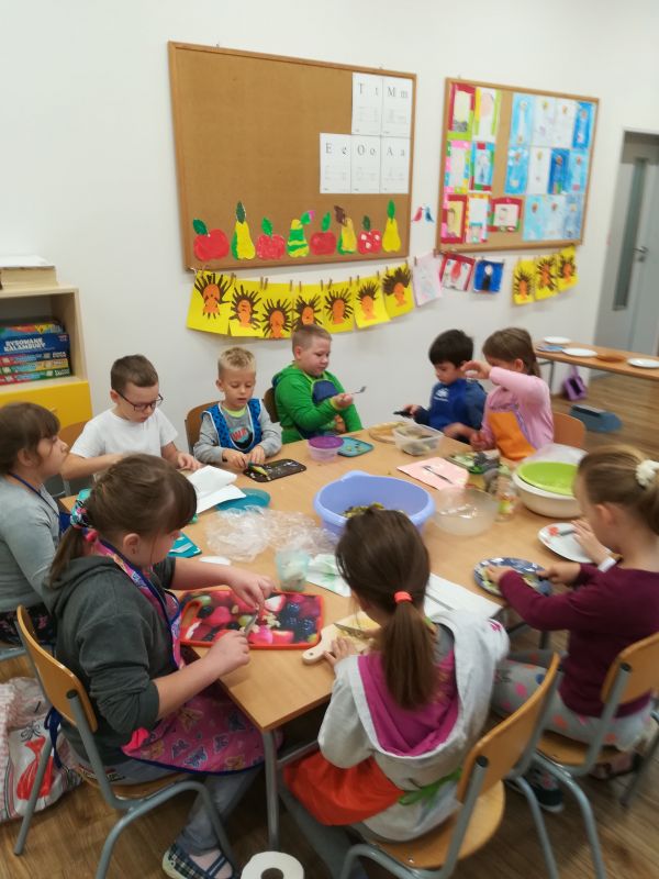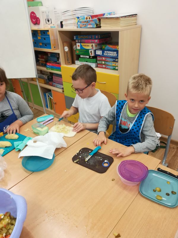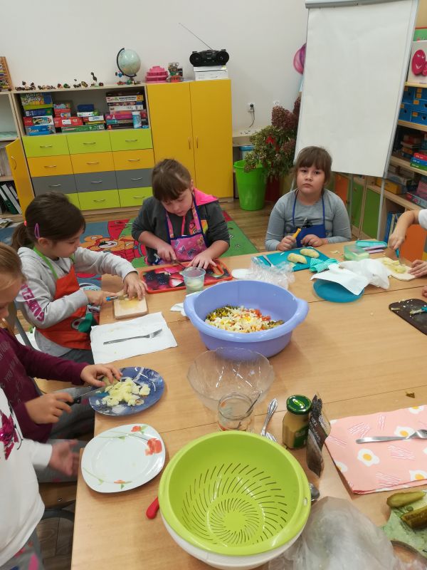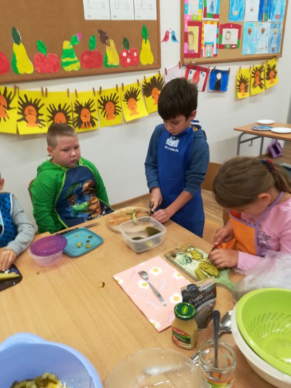 Czas na jesienne zbiory. W warzywniaku klasowym pojawiły się warzywa z naszych ogrodów. Można je dodawać do sałatek, na kanapki i jako dodatek do obiadu, a na podwieczorek najlepszy będzie sok warzywny. Dzisiaj zrobiliśmy sałatkę jarzynową. Smaczne i zdrowe danie. Polecamy wszystkim:)