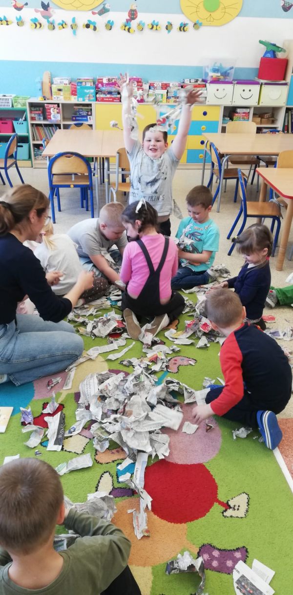 23 maja 2022 roku odbyły się kolejne warsztaty przyrodnicze dla najmłodszych uczniów. Tym razem dzieci rozwijały swoją kreatywność z użyciem gazet. Nie zabrakło gimnastyki z gazetami, czy papierowej muzyki. Odbyła się także bitwa gazetowa. Były też zabawy ruchowe na gazetowych tratwach. Na zakończenie dzieci rozwijały percepcję wzrokową w zabawie "literowy detektyw".