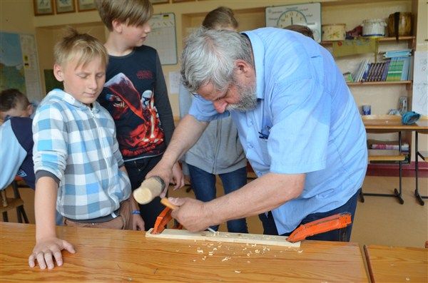 W dniu 6 czerwca 2017 r. gościł w naszej szkole rzeźbiarz z Pracowni Rzeźbiarskiej w Łęczycach. Uczniowie z klas I - VI, uczęszczający na lekcje języka kaszubskiego, wzięli udział w warsztatach rzeźbiarskich. Wszyscy mieli okazję podziwiać wyroby gościa m. in. figurki, patery, obraz przedstawiający Gdańsk, a także krzesło papieskie, na którym dzieci robiły sobie zdjęcia. Uczniowie poznali narzędzia rzeźbiarskie potrzebne w pracy. Każdy uczestnik warsztatów otrzymał deseczkę, na której wyrzeźbił dowolne imię.