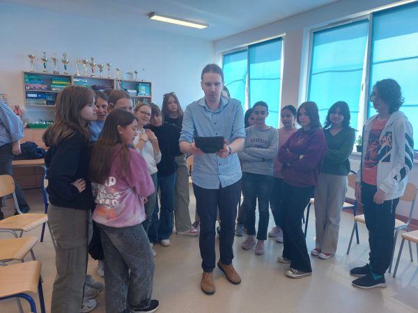 Dla uczniów z klas VI-VIII przygotowano warsztaty VR- Virtual Reality-wirtualna rzeczywistość, czyli przedstawienie wirtualnego świata w taki sposób, że widziane w nim obiekty sprawiają wrażenie fizycznej, przestrzennej obecności. Jeżeli założymy na głowę "gogle wirtualnej rzeczywistości" oraz słuchawki-dwa nasze zmysły poznawcze, czyli wzrok i słuch zostaną odcięte od bodźca zewnętrznego. Uczestnicy po warsztatach przekonali się, ze po założeniu gogle VR widz będzie nie tylko biernym uczestnikiem akcji aplikacji, ale również będzie mógł w sposób świadomy na nią wpłynąć.