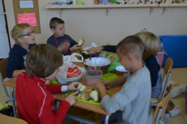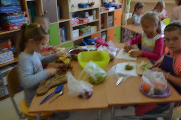 27 września uczniowie klasy III odkrywali wiedzę na temat zdrowego odżywiania. Rozwiązywali zagadki o owocach i rozpoznawali je. Oczywiście poznawali je też zmysłem smaku, ponieważ przygotowali sałatki owocowe według własnych przepisów. Było smacznie i kolorowo!
