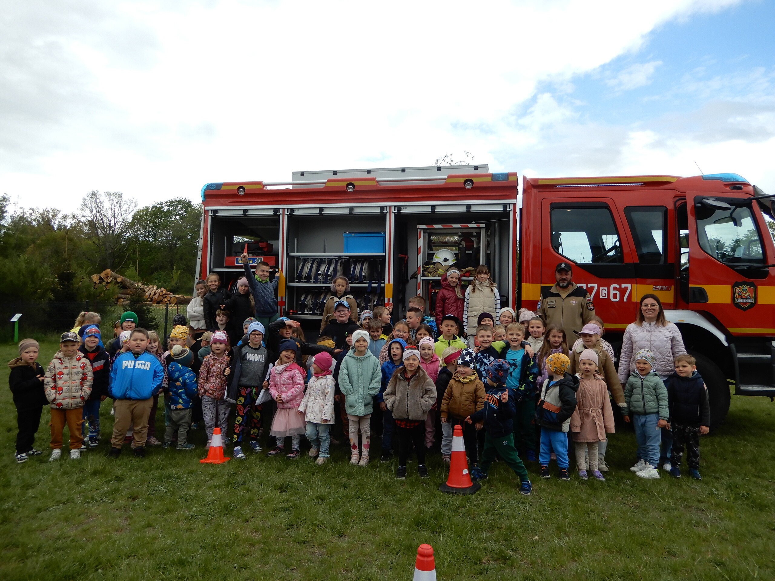 Wizyta strażaków w naszej szkole wzbudziła ogromne zainteresowanie dzieci. W trakcie spotkania strażacy zaznajomili dzieci ciekawostkami związanymi z ich pracą zawodową, przestrzeganiem zakazów, zachowaniem bezpieczeństwa w czasie pożaru, burzy oraz wypadku. Dzieci dowiedziały się w jakich okolicznościach można wezwać straż pożarną, że strażacy nie tylko gaszą pożary, ale również są wzywani do wypadków samochodowych. Dzięki takim spotkaniom dzieci poznają ciężką i odpowiedzialną pracę strażaka. Na zakończenie spotkania strażacy przygotowali tor sprawnościowy z wężami strażackimi. Spotkanie odbyło się w przesympatycznej atmosferze.